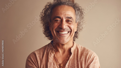 A happy senior man in neutral clothes poses in a beige studio. Generative AI