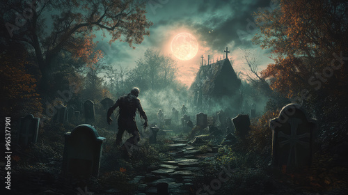 A haunting cemetery scene with zombies clawing their way out of graves, their skeletal forms illuminated by eerie moonlight.
