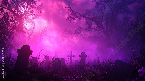 A haunting graveyard scene shrouded in eerie purple mist, with tombstones silhouetted against a spectral sky.