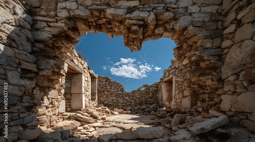 A heart-shaped hole in a crumbling stone ruin opens up to a bright blue sky with a single cloud. A powerful concept of hope, love, and resilience.