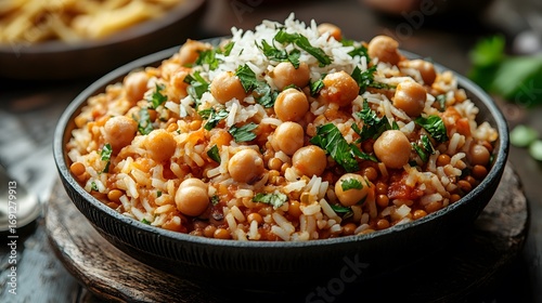 A hearty bowl of aromatic rice pilaf, brimming with chickpeas, lentils, and a flavorful tomato-based sauce, garnished with fresh herbs and a sprinkle of toasted coconut.