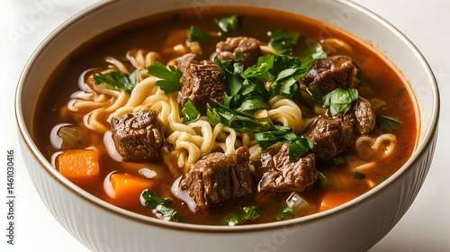A hearty bowl of beef noodle soup features tender beef cubes, egg noodles, and vibrant vegetables in a rich savory broth.