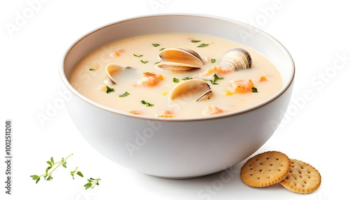 A hearty bowl of clam chowder with oyster crackers, served in a rustic ceramic bowl