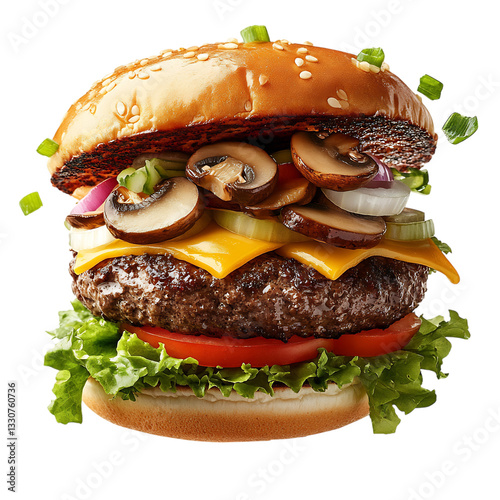 A Hearty Burger with Mushrooms, Swiss Cheese and Onions Isolated on Transparent Background