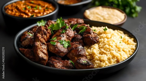 A hearty dish of tender beef stew served over a bed of fragrant fluffy rice garnished with fresh herbs for a delicious and nourishing meal