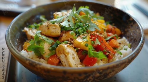 A hearty Japanese rice bowl, topped with teriyaki chicken and fresh vegetables,