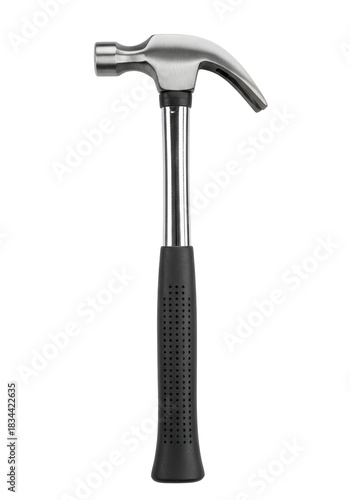A heavy-duty steel claw hammer with a polished chrome handle and a black rubber grip, isolated on a white background with studio light. Concept of professional hardware