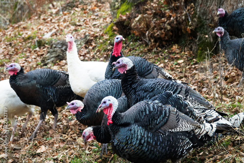 A herd of turkeys in the autumn forest on self-grazing, turkey breeding