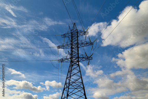 A High Voltage Power Transmission Tower Stands Tall Against a Clear Blue Sky Above Us