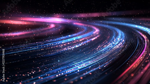 A high-energy 3D depiction of rapidly moving stripe lines with radiant sun flares. Motion blur captures velocity. Suggests business leadership, innovative technology, and warp-speed wormhole