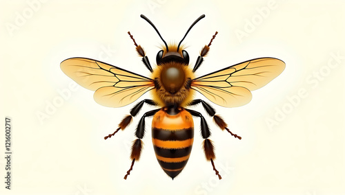A highly detailed diagram of a honeybee, showcasing its anatomy with labeled parts, including the wings, stinger, and compound eyes, against a clean, neutral background for educational use.