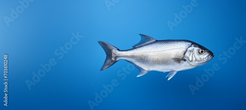 A high-quality portrait captures a gaunt, swirling silver fish swimming underwater against a blue background.
