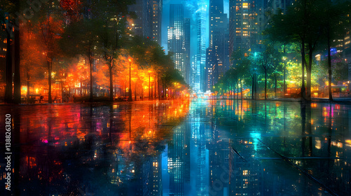 A high-resolution wallpaper of an urban cityscape at night, with glowing lights from skyscrapers and reflective surfaces creating a dynamic, modern look