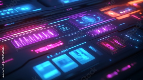 A high-tech AI interface with personalized suggestions for a user daily activities, glowing holographic panels with different colors.