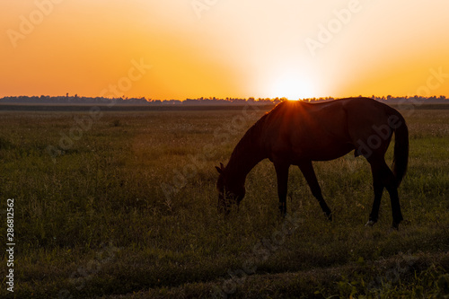A horse grazes in a field at sunset. Backlit warm light from the sun going beyond the horizon.