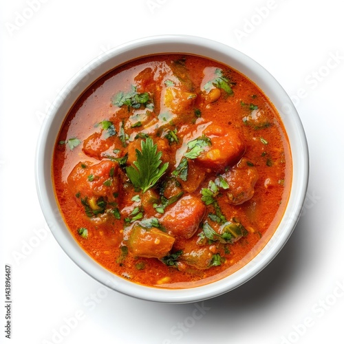 A hot, red bowl of traditional tomato soup features both hearty meatballs and crusty bread, making it a satisfying meal