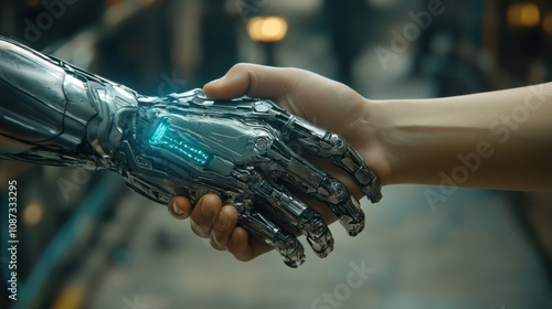 A human hand shakes a robotic hand, symbolizing partnership between humanity and technology.