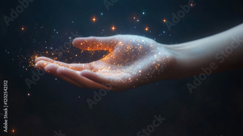 A human hand transforms into a digital hand, symbolizing the convergence of humanity and technology in the age of AI, with a blurred modern background and empty space for captions