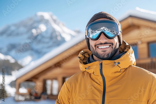 a indian man smiling in front of a wooden cabin, wearing a ski jacket and goggles, snowy mountain backdrop