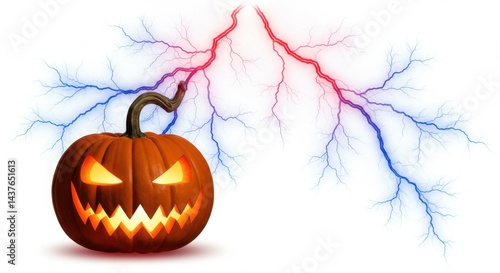 A jack o lantern with a spooky face and lightning strikes on a bright white background design effect