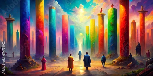 A Journey Through the Gates of Color, Digital Painting, Colorful Pillars, Fantasy Landscape, Abstract Art, Surrealism , Gateways