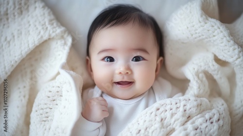A joyful baby wrapped in a cozy white blanket with a bright smile at home during daytime