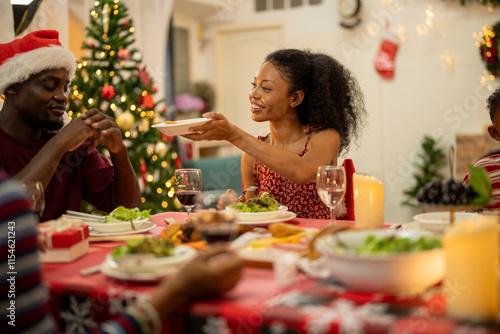 A joyful Christmas celebration with friends gathered around a festive dining table. Featuring a man in a Santa hat, a decorated Christmas tree, delicious food, and warm holiday cheer.