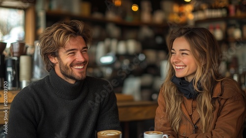 A joyful couple laughing over coffee in a cozy cafe. Generative AI