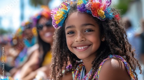 A joyful girl with curly hair smiles, adorned with colorful decorations at a festive event.