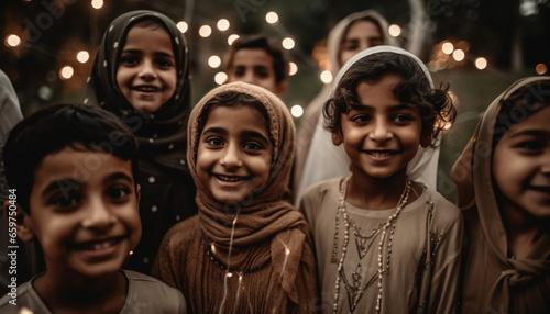 A joyful group of smiling children, boys and girls, outdoors generated by AI