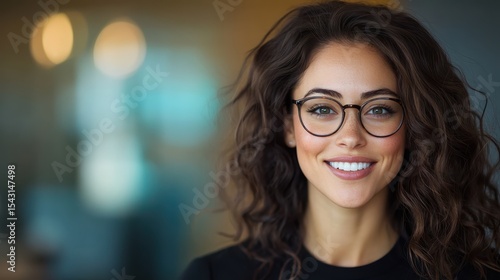 A joyful young woman with curly hair and glasses beams with a bright smile in a contemporary setting, highlighting the essence of happiness, openness, and self-assurance.