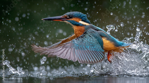 A kingfisher bird emerging from water with wings spread in a burst of splashing droplets around it