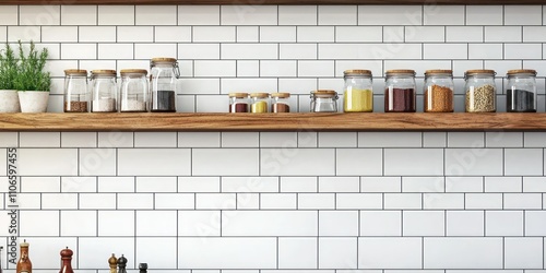 A kitchen wall with white subway tiles and wooden shelves holding jars, spices, and kitchen tools.