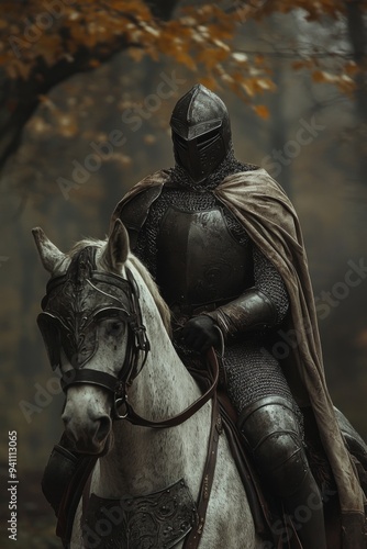 A knight in full armor rides a white horse through a misty forest.