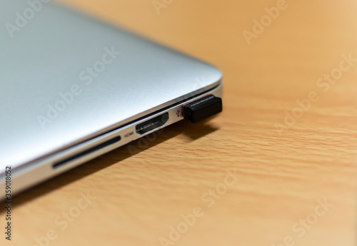 a laptop chagrging and USB ports, Selective focus, Selective focus on subject, background blur