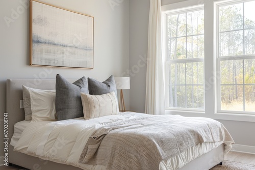 A large bed with a white comforter and pillows