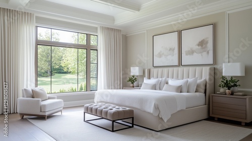 A large bedroom with a white bed, white curtains, and a window. The curtains are open, letting in natural light. The room has a clean and minimalist design