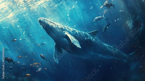 A large blue whale swimming gracefully through the deep ocean, surrounded by schools of fish and other sea life.
