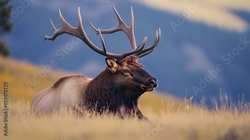 A large elk resting in a meadow with antlers in full display against a soft natural backdrop.