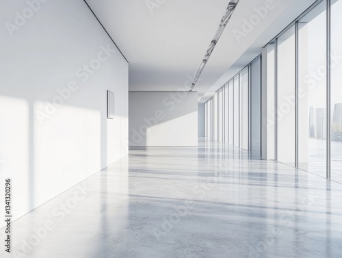A large, empty room with a white wall and a white floor. There is a window in the room