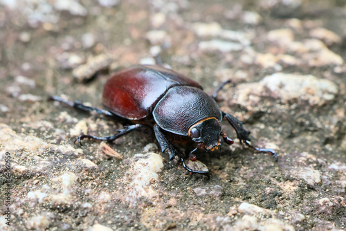 A large, female stag beetle on a rock. Highly detailed stag beetle. Natural female stag beetle