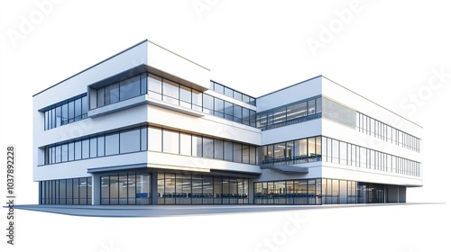 A large high school building with science labs and modern classrooms, educational architecture, photorealistic style, neutral tones, isolated on white background