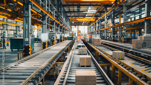 A large industrial building with a lot of windows and a yellow line on the floor. Scene is industrial and modern