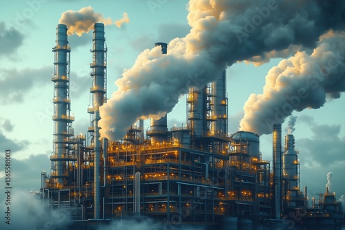 A large industrial complex with multiple smokestacks emitting thick clouds of smoke against a twilight sky. The facility is illuminated with warm lights, showcasing a network of pipes.