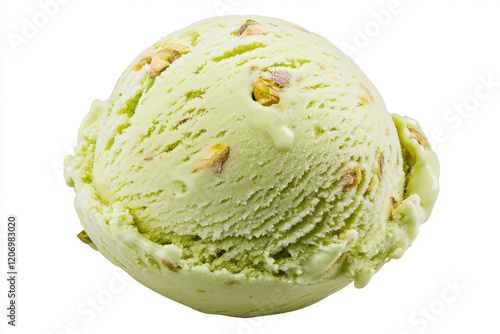 A large scoop of green ice cream with pistachios on top, against a white background