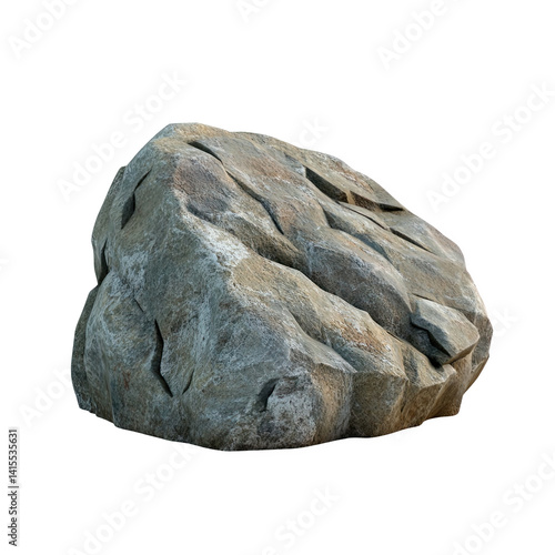 A large, textured rock featuring a rugged surface, isolated on a white background for clear visibility.
