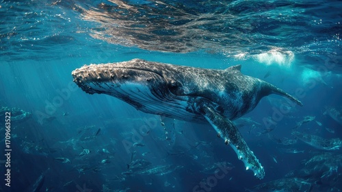 A large whale swims in the deep ocean. Light shines through the surface, sparkling. Surrounded by a school of small fish, it moves.