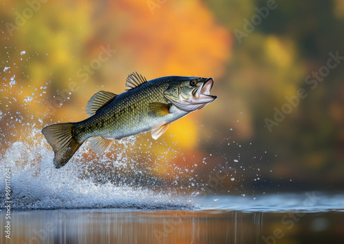 A largemouth bass dramatically jumps out of the water, creating splashes, with a blurred natural background in a serene fishing scene.