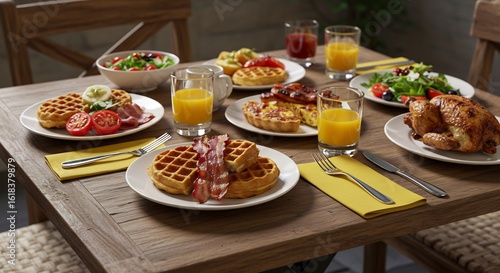 A lavish breakfast spread featuring waffles, bacon, roasted chicken, salads, and various other dishes, served with orange juice and a variety of garnishes.