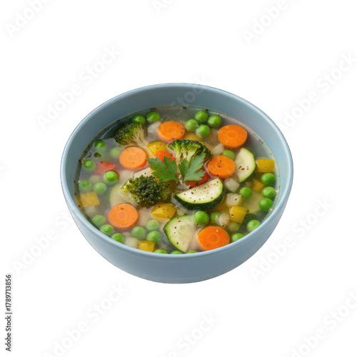 A Light Blue Bowl Filled with Vibrant Vegetable Soup Featuring Carrots Peas Broccoli Zucchini and Bell Peppers Garnished with Parsley and Black Pepper on a Transparent Background